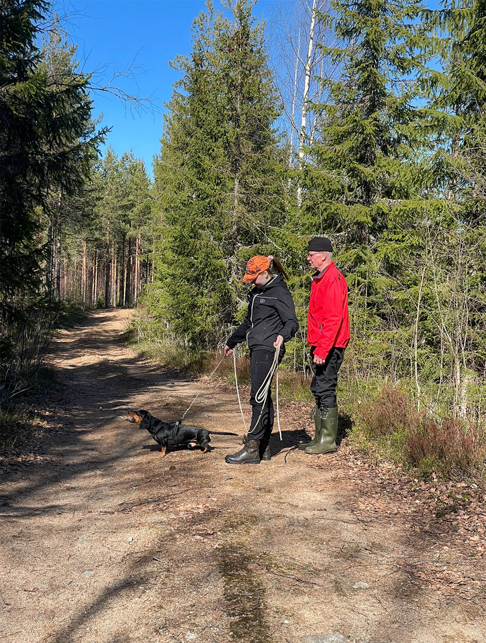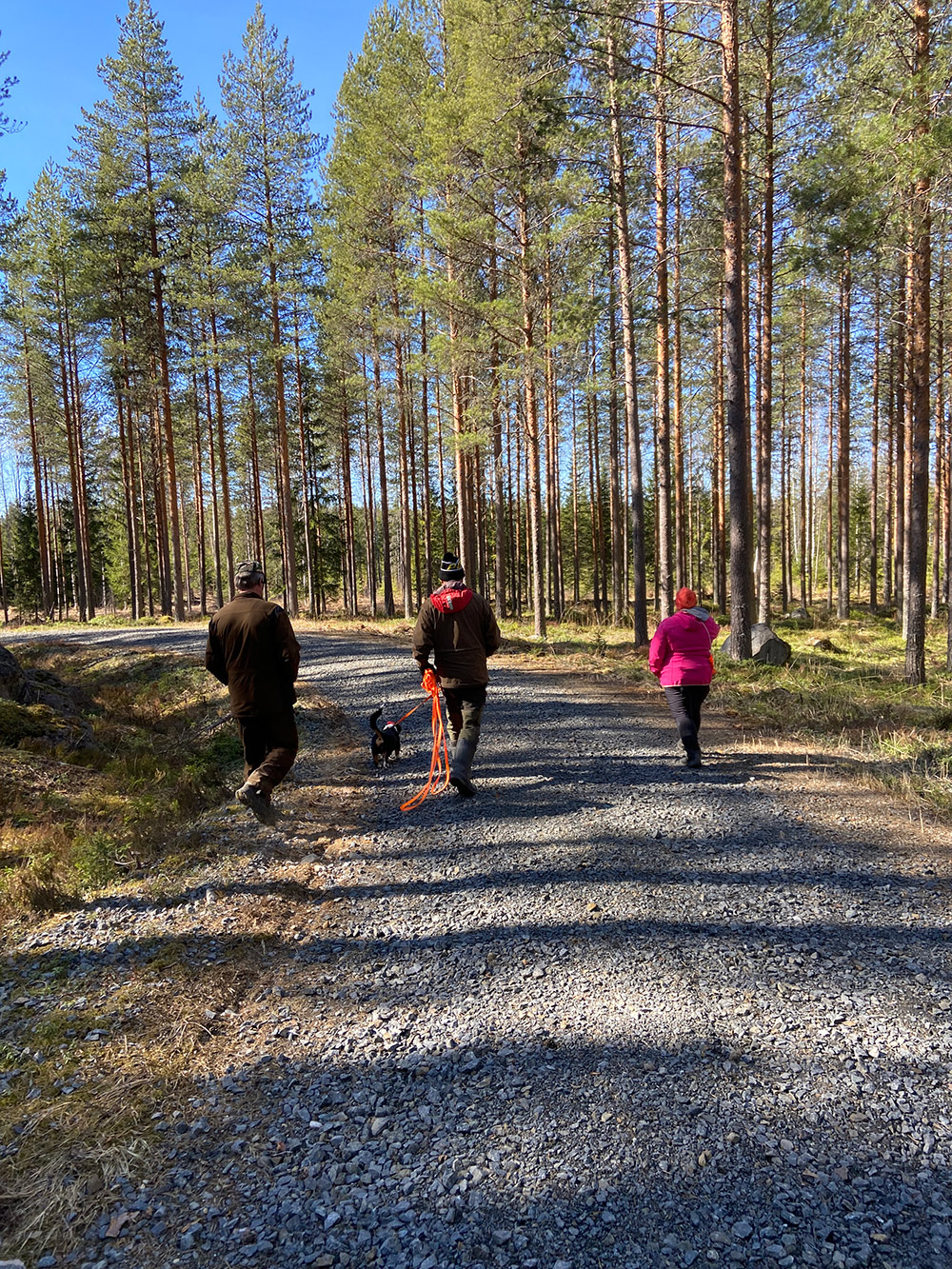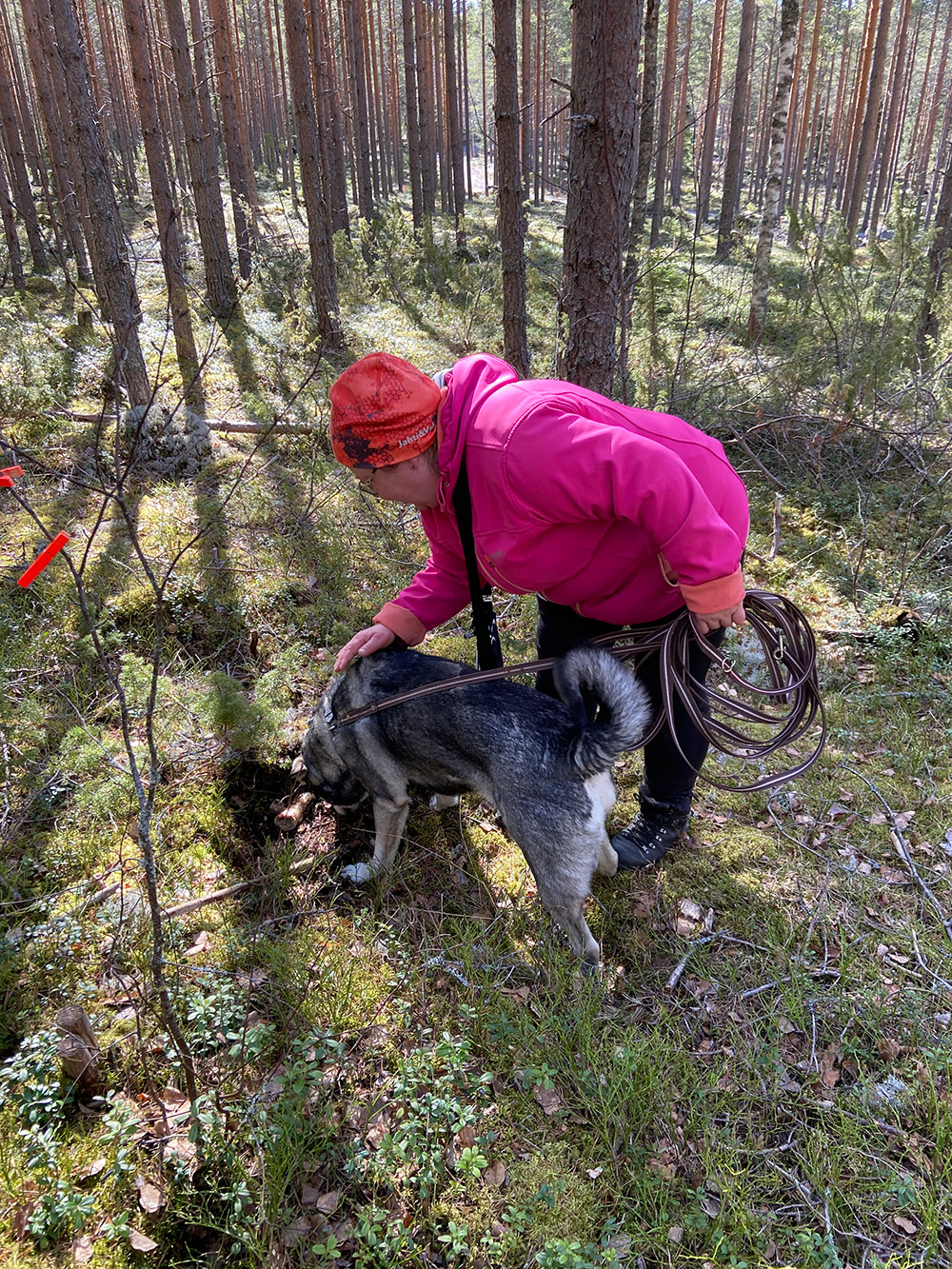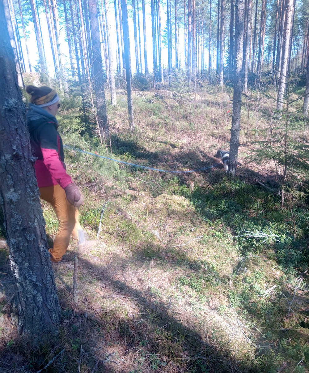 Teoriaosuuden jälkeen siirryttiin testaamaan juuri saatuja oppeja käytännössä maastoihin. Osallistujat jaettiin kolmeen ryhmään, jossa kussakin oli kaksi koiraa, ryhmänvetäjä ja kuunteluoppilaat.