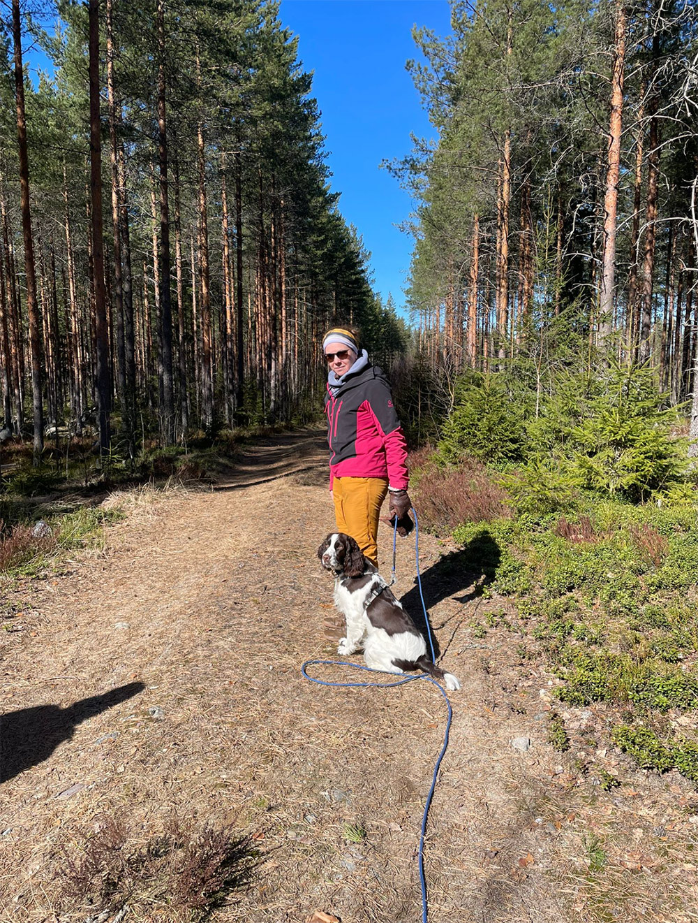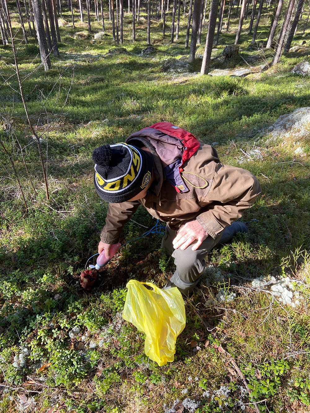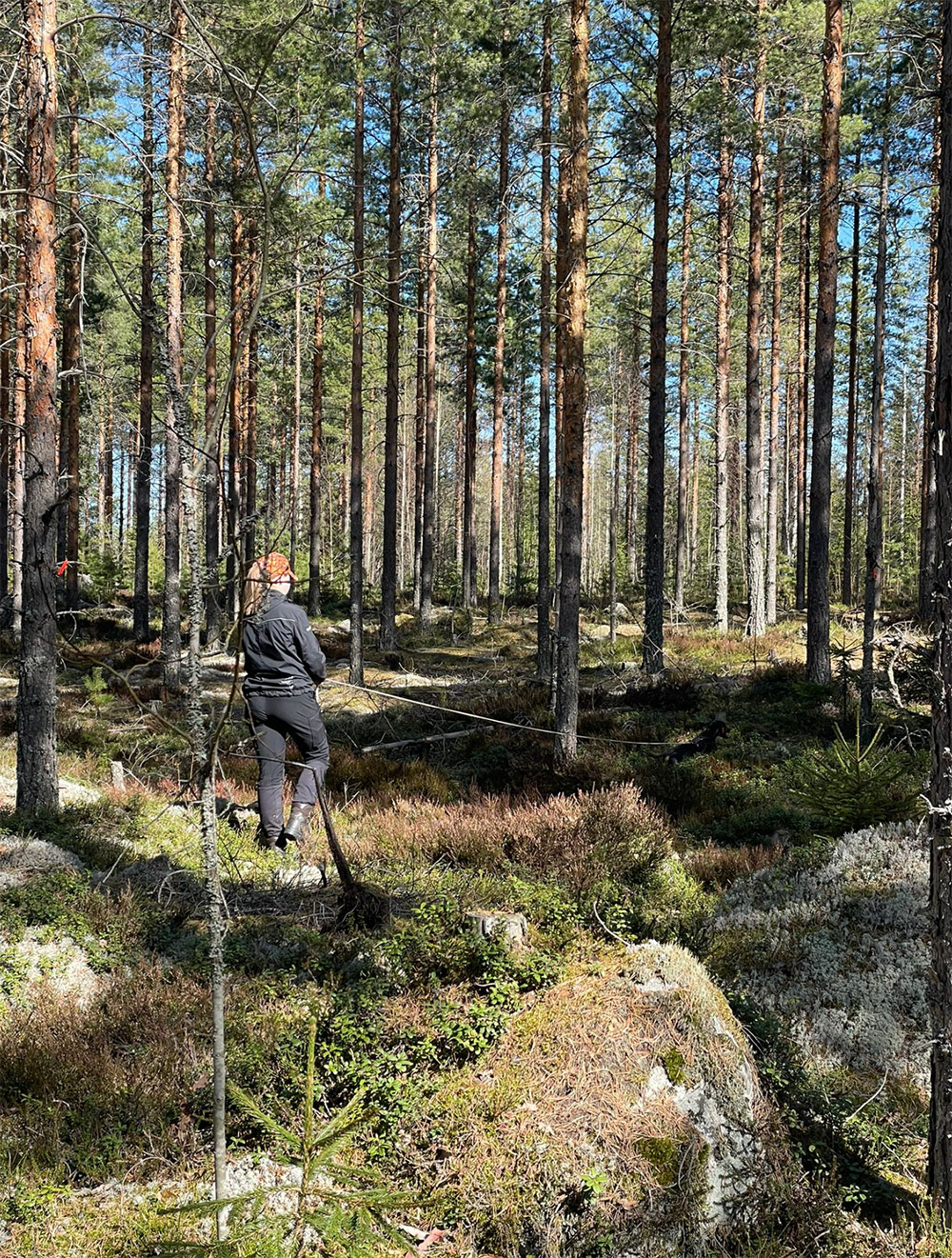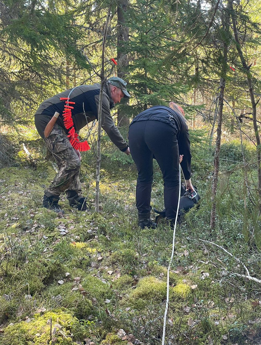 Teoriaosuuden jälkeen siirryttiin testaamaan juuri saatuja oppeja käytännössä maastoihin. Osallistujat jaettiin kolmeen ryhmään, jossa kussakin oli kaksi koiraa, ryhmänvetäjä ja kuunteluoppilaat.