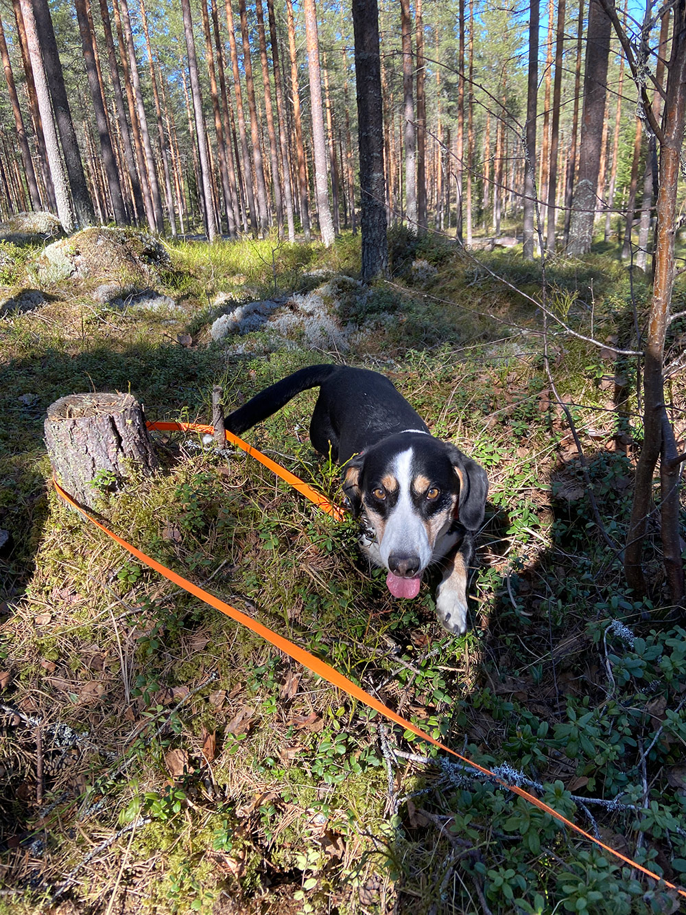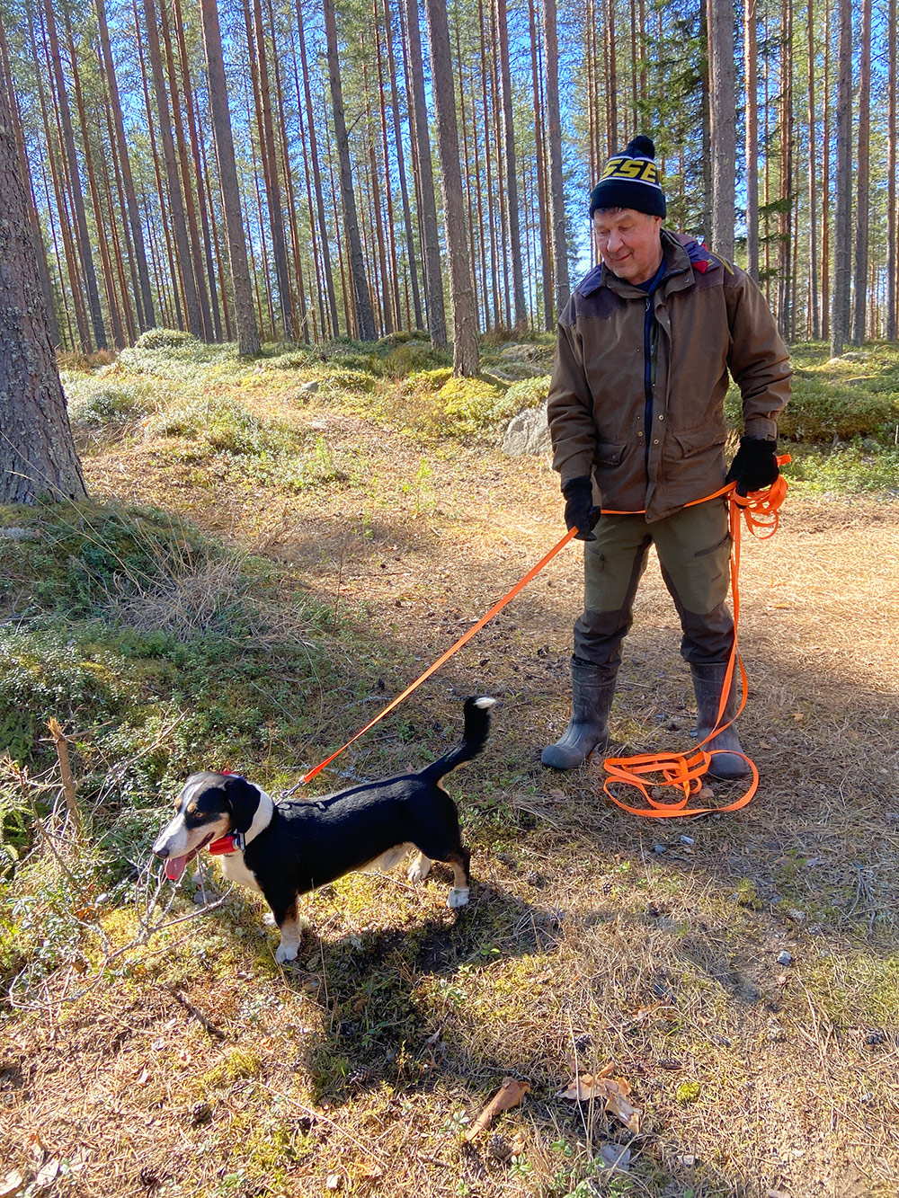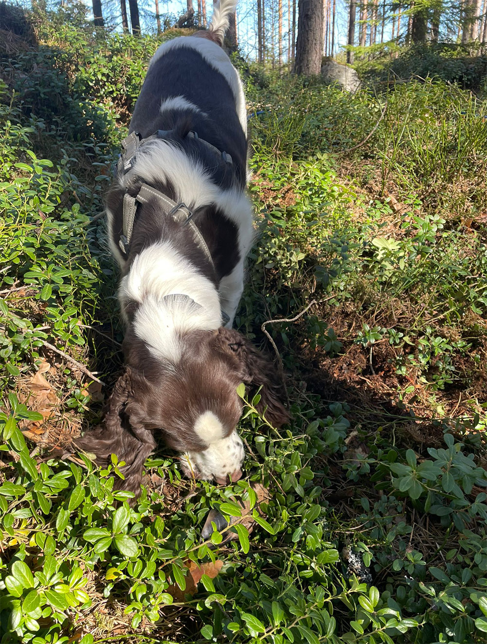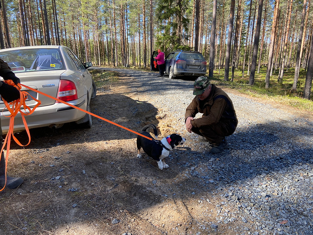 Päivän kohokohta oli jälkien ajaminen. Jokainen suoritus oli omananäköisensä: oli ilmavainuista ja jälkitarkkaa työskentelyä, oli rauhallisempaa ja vauhdikkaampaa menoa, oli iän tuomaa arvokkuutta ja pentukoiran riehakkuutta. Lopputulos oli kuitenkin kaikilla sama: kaato löytyi jäljen päästä!