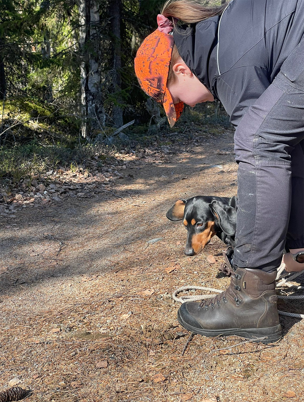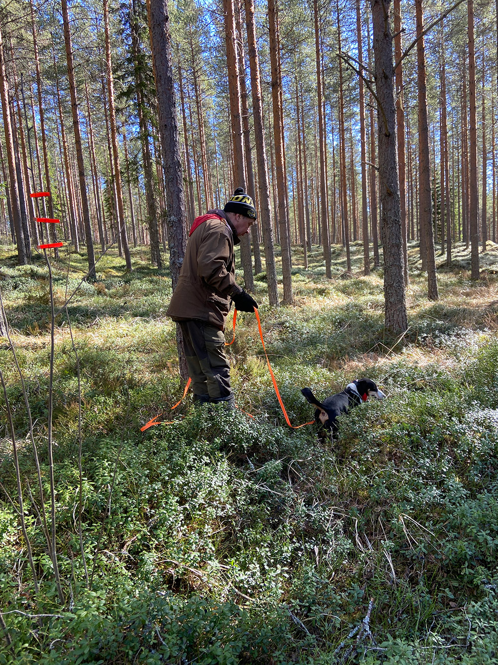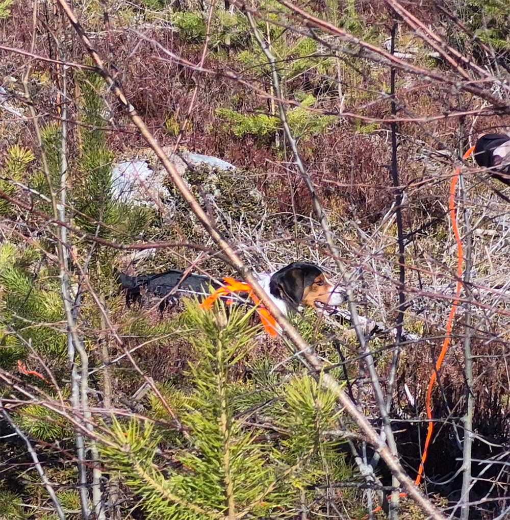 Päivän kohokohta oli jälkien ajaminen. Jokainen suoritus oli omananäköisensä: oli ilmavainuista ja jälkitarkkaa työskentelyä, oli rauhallisempaa ja vauhdikkaampaa menoa, oli iän tuomaa arvokkuutta ja pentukoiran riehakkuutta. Lopputulos oli kuitenkin kaikilla sama: kaato löytyi jäljen päästä!